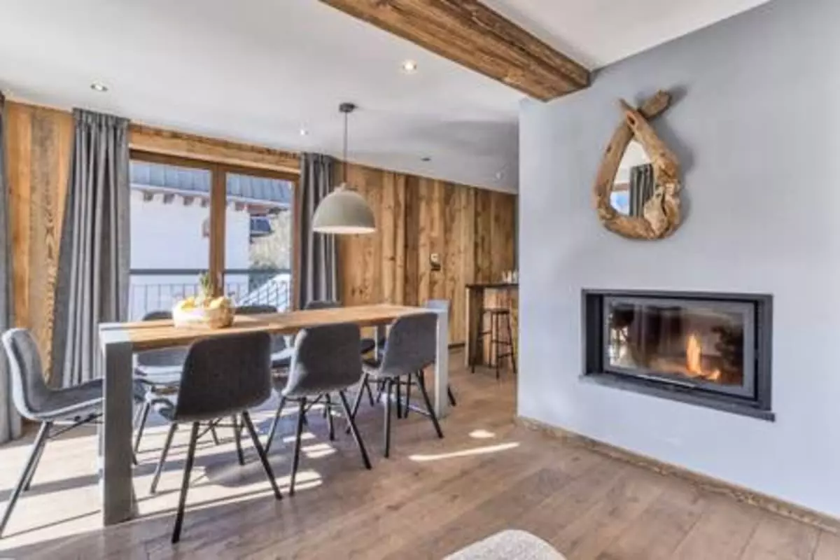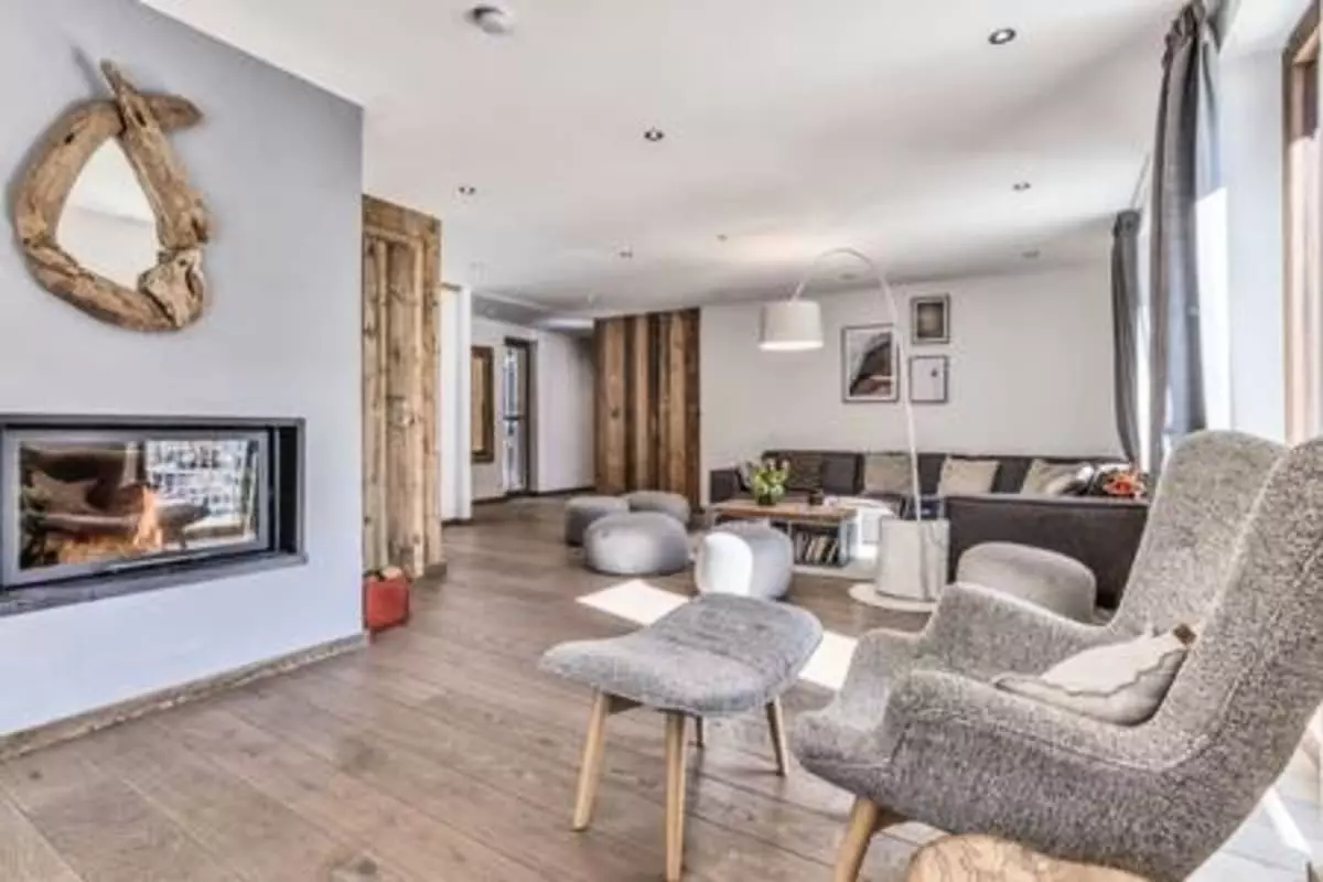 - un grand séjour de 50 m2 avec salon et salle à manger avec une cheminée et un grand balcon avec vue sur le Mont-Blanc