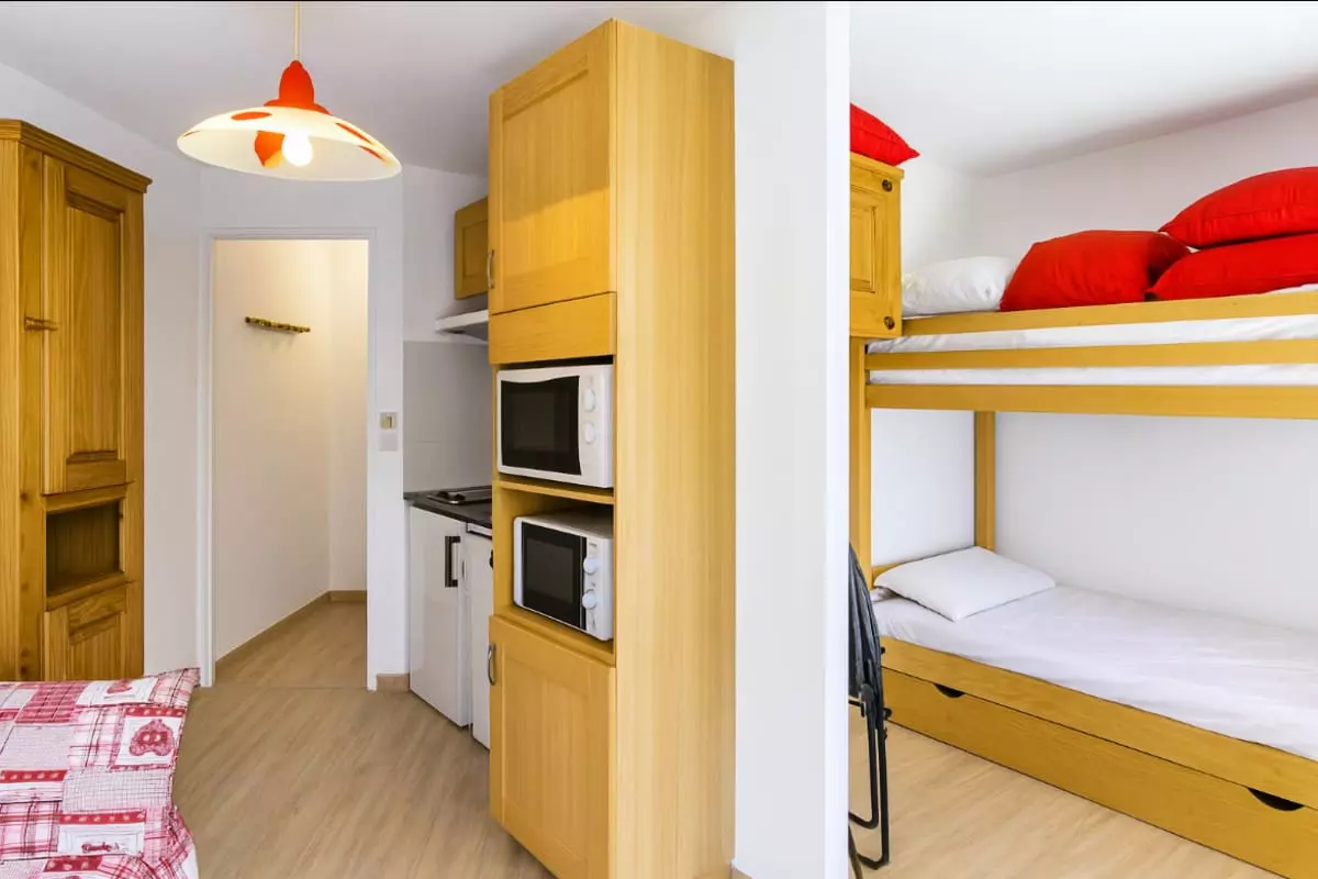 La pièce à vivre est composée d'un coin nuit avec un lit superposé ; d'une salle de douche ; d'une cuisine équipée et d'un coin détente avec un canapé lit, donnant sur le balcon offrant une jolie vue.